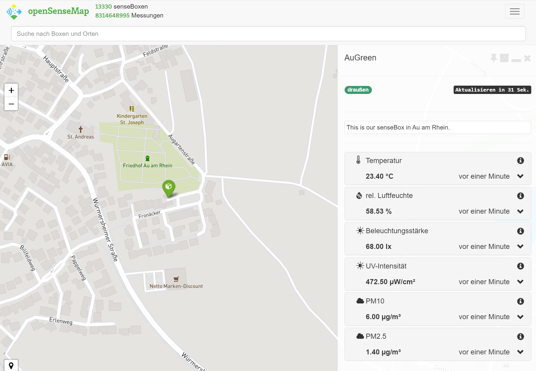 Wenn Ihr die Daten von unserer Sensebox sehen wollt, dann findet Ihr diese hier (live): https://sensebox.curth.de